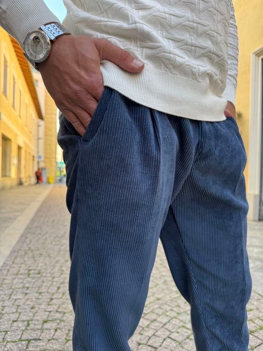OVER-D Pantalone terepred in velluto blu a coste sottili