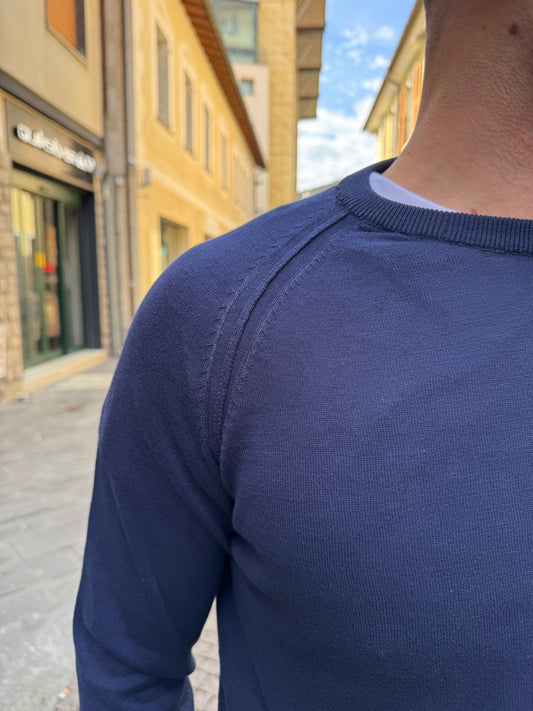 GUESS Maglione girocollo blu con logo contrasto grigio