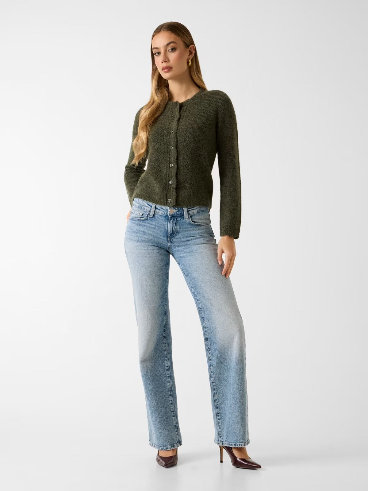 Jeans a vita bassa in denim azzurro chiaro, gamba dritta leggermente ampia, lavaggio uniforme e taglio pulito, abbinati a décolleté a punta.